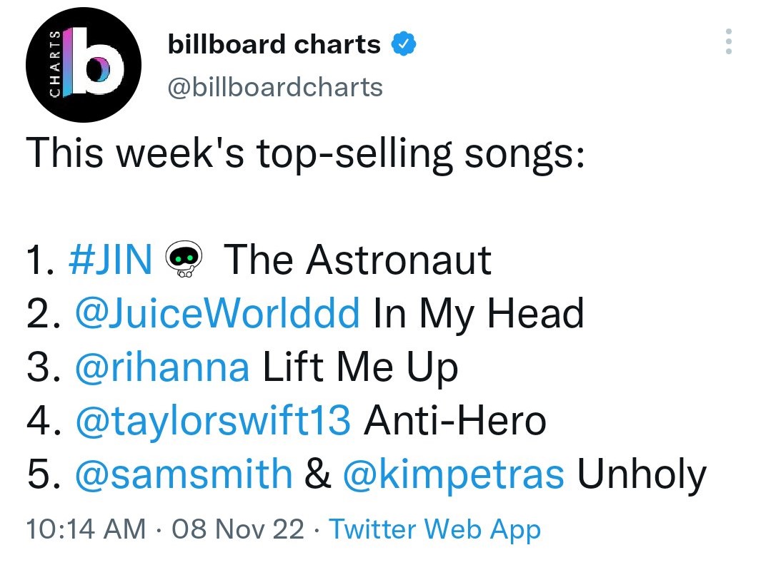 221108 | The Astronaut: #10 Billboard Global200. #1.Billboard Digital Song Sales. #1. World Digital Song Sales. #1. Emerging Artists. #6. Global 200 Excl. US. #10. Artist 100. #43. Japan Hot 100. #51. Hot 100. The Astronaut” debuts at #1 on the global YouTube songs chart with 47.7 million stream. debuts inside the Top 10 of the Billboard Japan Top Download Songs at #8!!